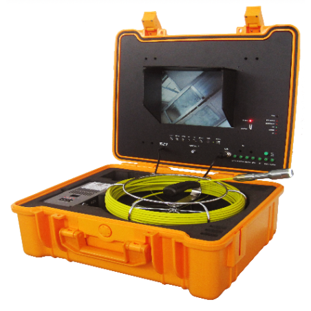 Cámara de inspección compuesta de maleta de pvc alta resistencia, pantalla de 10", botonada de uso en panel frontal, bateria de autonomía 3h, grabación mediante memoria USB de imagenes fijas y video.